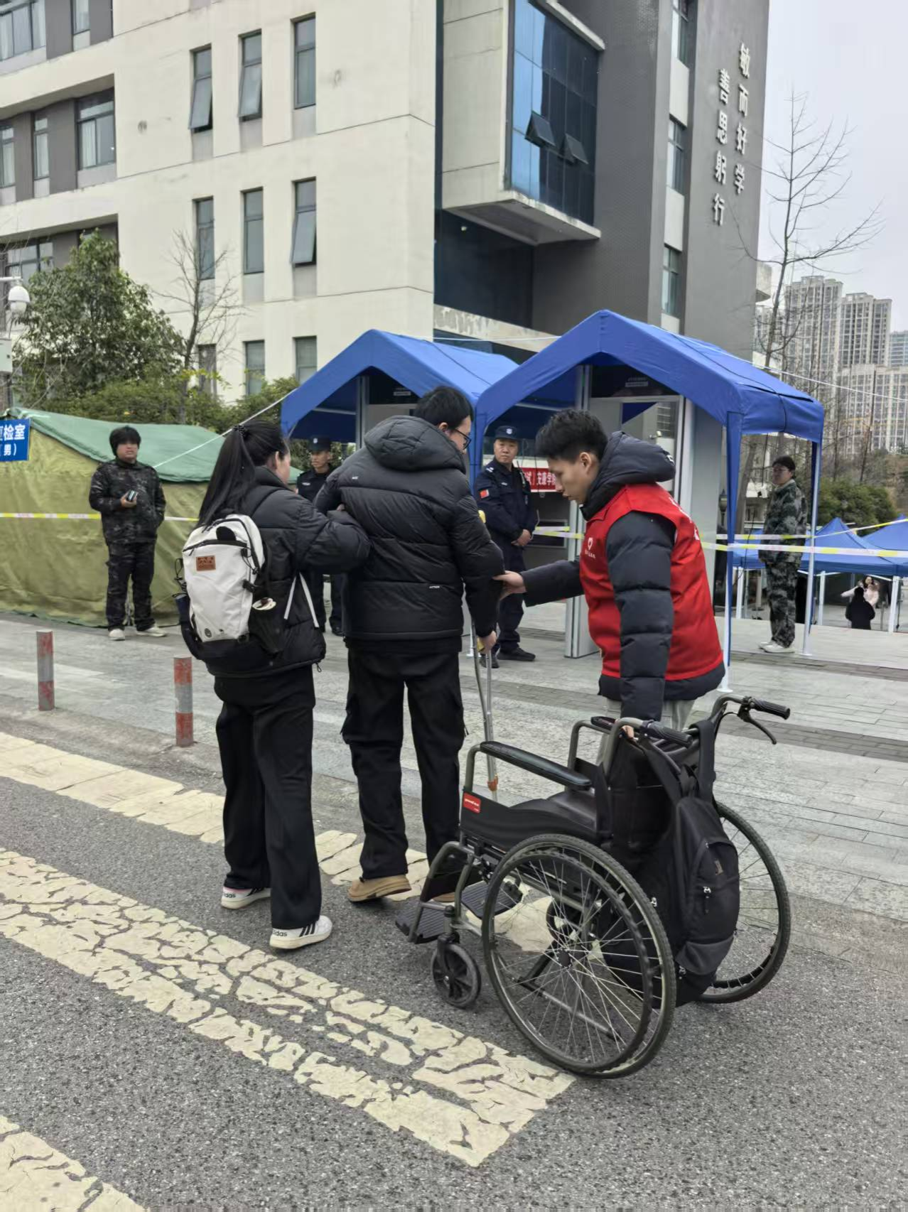 本次志愿服务工作聚焦考生需求,构建起全方位保障体系,主要涵盖三大方面:一是违禁物品存取服务。在考点入口附近设立标识清晰的寄存点,志愿者细致高效地为考生提供物品临时寄存与看管服务,确保入场秩序顺畅,以 “小事做实” 的态度筑牢考试保障第一道防线。二是考点道路引导与秩序维护。志愿者们不畏冬日严寒,坚守在关键路口和通道,为考生提供清晰路线指引,同时配合考点工作人员开展人流疏导,有效维护考场外围环境的有序稳定,用坚守诠释 “互助” 精神的实践意义。三是设立 “考研加油站” 暖心服务点。作为本次志愿服务的亮点环节,服务点免费为考生提供姜汁可乐、暖身糖果、一次性雨衣及御寒应急物品。一杯杯热气腾腾的姜汁可乐驱散冬日寒意,一颗颗甜蜜糖果缓解考试压力,周全的准备让考生倍感安心,将学校的关怀转化为直抵人心的温暖行动。